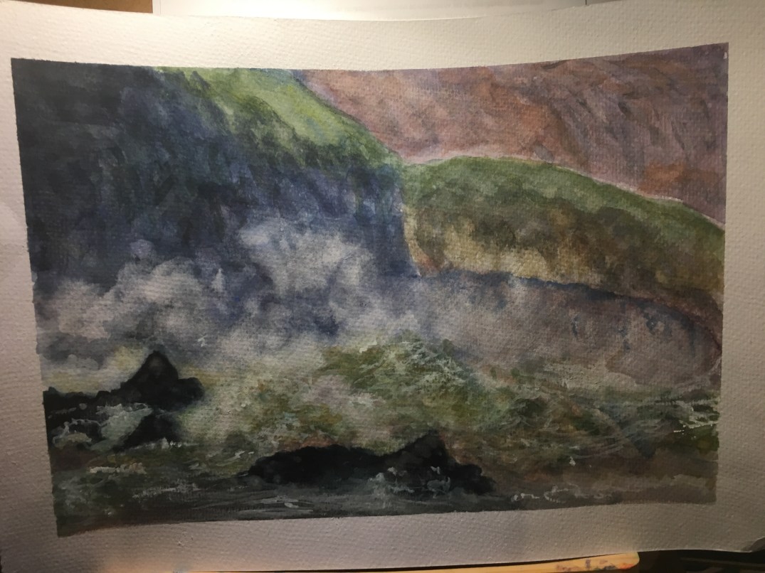 When I saw a picture of a wild wave reaching rocky coast my heart skipped. I was so happy we will learn how to paint that but had no idea it´s not that easy at all. Well unfortunately my picture is not wild sea wave but more of a peaceful misty cliff.